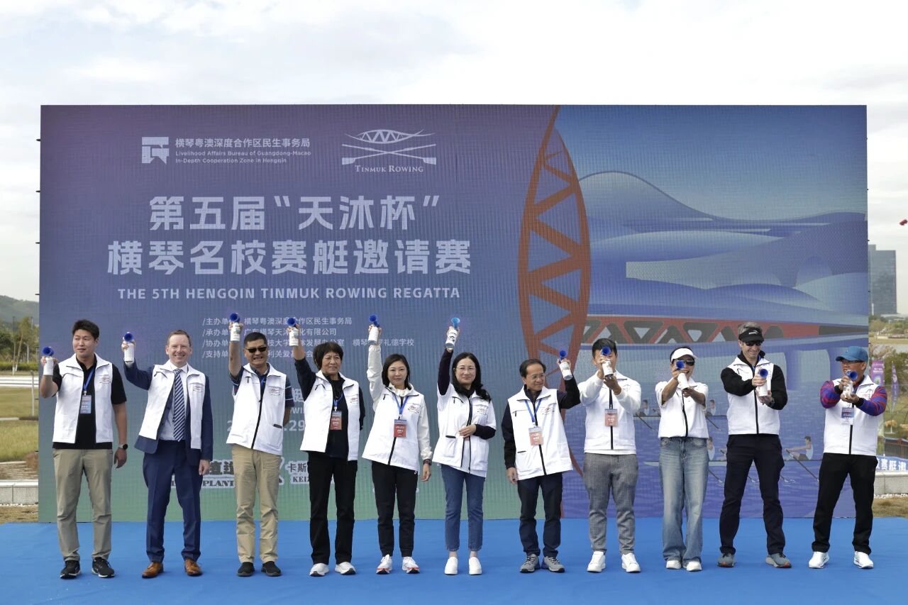 现场,来自合作区民生事务局、澳门特区政府体育局、中国澳门赛艇总会理事会、西澳赛艇协会(Rowing Western Australia)、韩国国立体育大学(Korea National Sports University)、马来西亚赛艇协会(Malaysia rowing association)等单位机构的领导及代表共同为赛事鸣枪,宣布第五届“天沐杯”横琴名校赛艇邀请赛正式开赛。