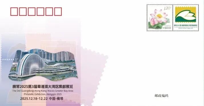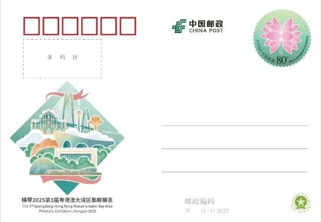 仪式现场,《横琴2025年第3届粤港澳大湾区集邮展览》JP纪念邮资明信片及纪念封正式首发,一经上线即大受邮友欢迎。邮资明信片一套1枚,面值80分,发行量达68万枚,图案设计融合了港珠澳大桥及横琴和澳门多个代表性建筑,构建了一幅“以邮为媒,湾区共生”的时代画卷,向世界展示琴澳融合的华彩乐章。圆形邮资图“并蒂莲”生动诠释了“琴澳一体,同根同源”的理念,展现了琴澳的地域特色和文化底蕴。