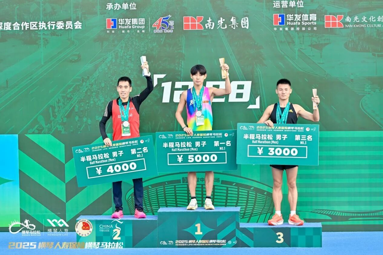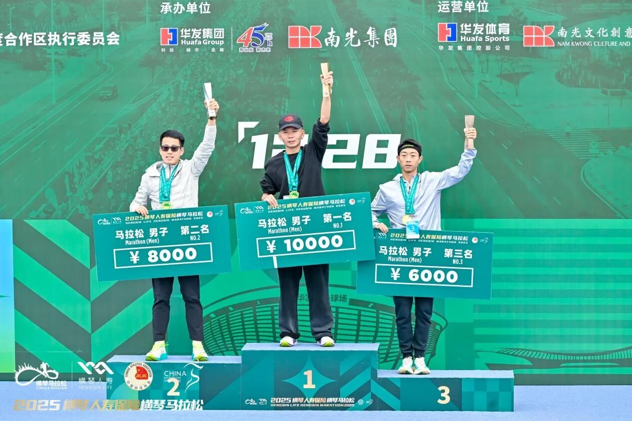 经过激烈角逐,2025横琴马拉松男子组冠军由朱家林以02:25:38的成绩夺得,崔家乐、万磊分别以02:25:52和02:26:43的成绩获得亚军和季军。