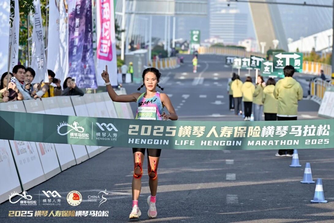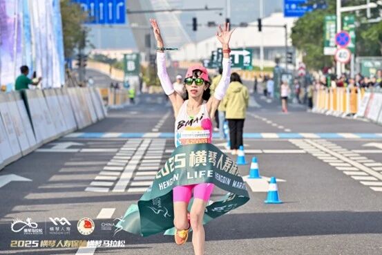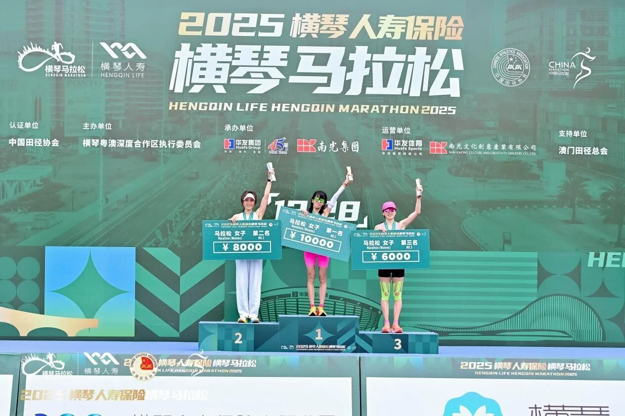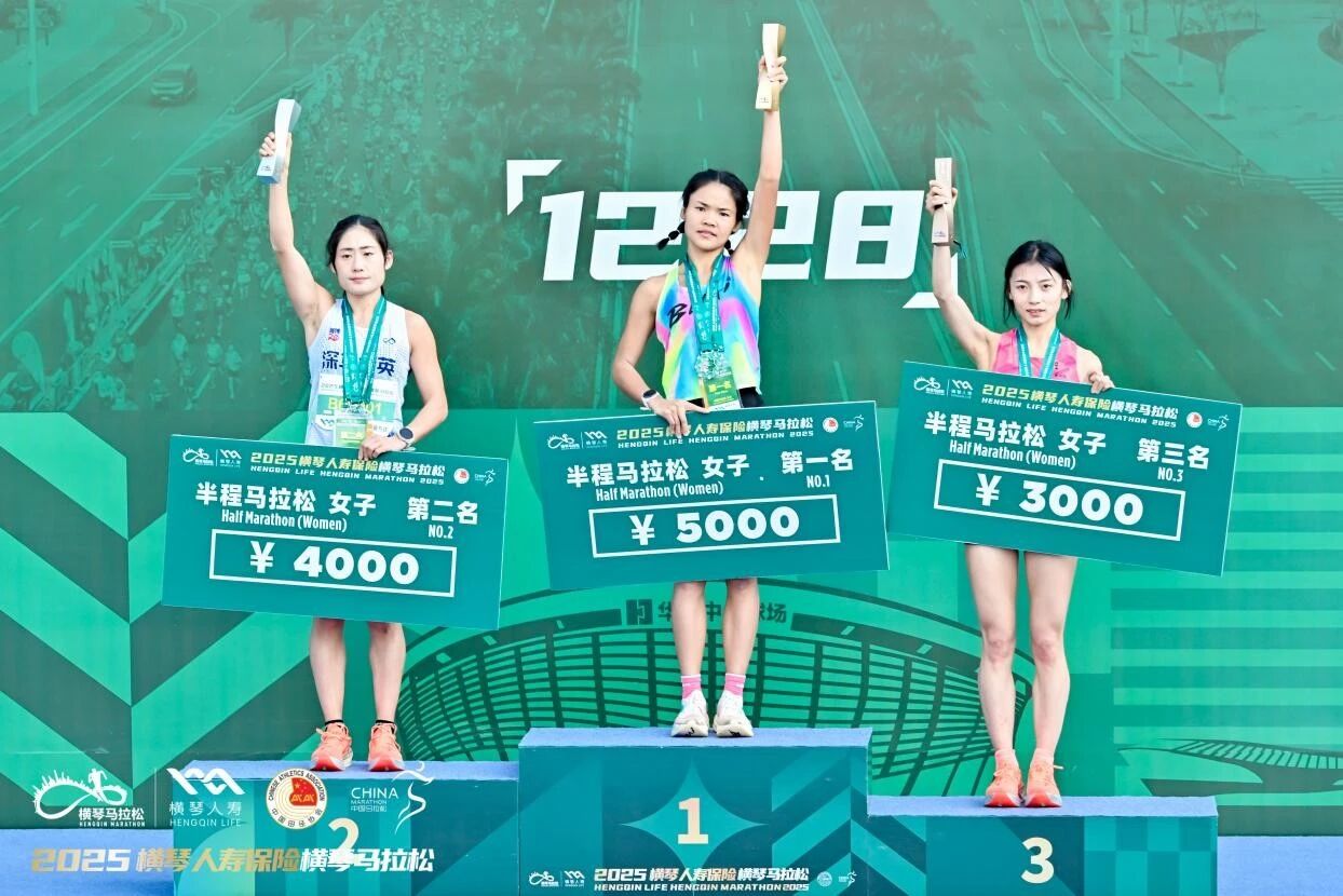 女子组,此前获得2024横琴马拉松女子冠军的韦春华,以 01:20:09 的成绩拿下2025横琴马拉松女子半马冠军;何芳和鲁佳怡分别以 01:21:14、01:24:00 的成绩获得亚军和季军。