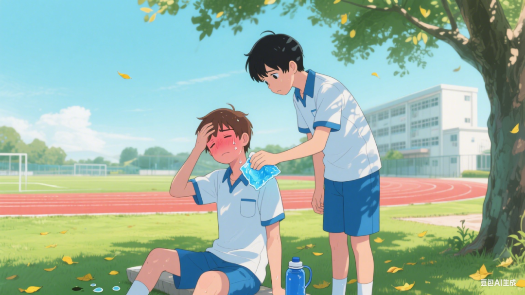 若在军训、体育课时出现头晕、恶心、大汗、呕吐、心跳快、体温升高等中暑先兆,同学们不要慌张,应立即移至阴凉处,用冷水或冰袋敷在颈部、腋下、腹股沟等部位,帮助身体快速降温,同时,要第一时间拨打120求助,让专业的医护人员来提供帮助。