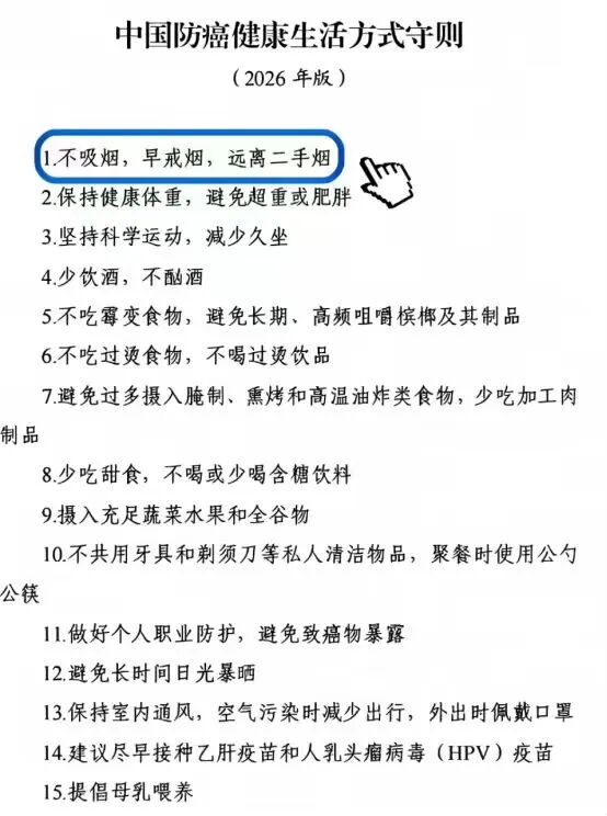 守则公布15条防癌法则,覆盖生活方方面面。第一条便是“不吸烟,早戒烟,远离二手烟”,但很多人第一条就没做到。