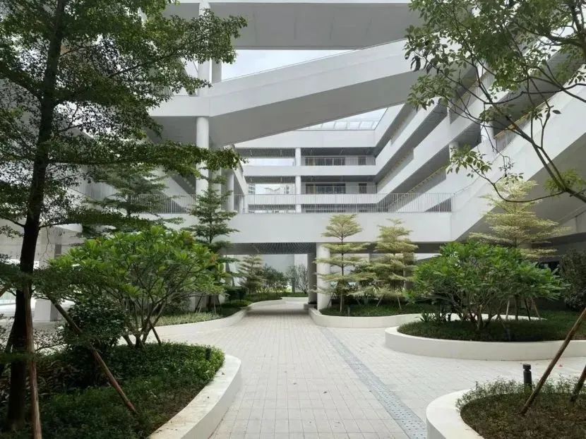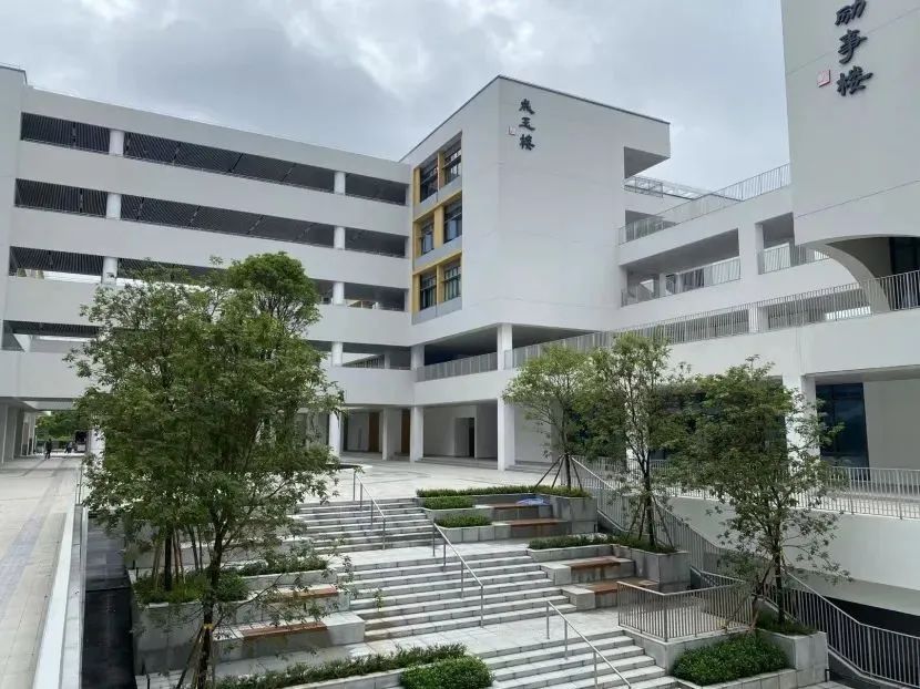 建筑形态充分回应岭南热带气候特征,在空间营造上,主要教学区采用“底层通透、上层围合”的庭院布局,通过富有韵律感的“飞梯”系统实现便捷的横向联系。既传承了岭南建筑的空间智慧,又充分融合地域特色与现代教育理念,为师生塑造美丽、舒适、安全而富有学术气息的校园。