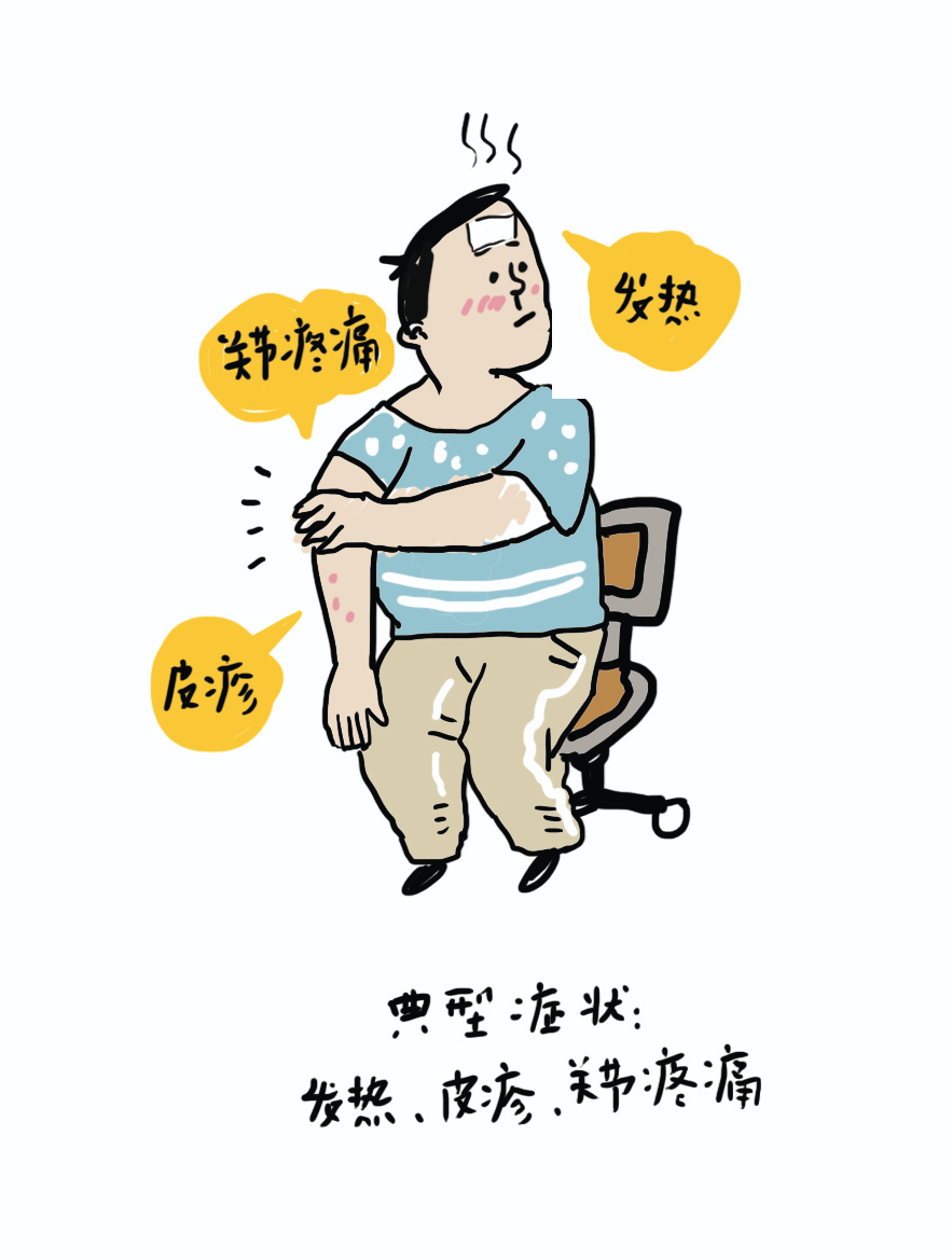 基孔肯雅热的主要临床表现为发热、关节痛和皮疹(约70%患者出现)。