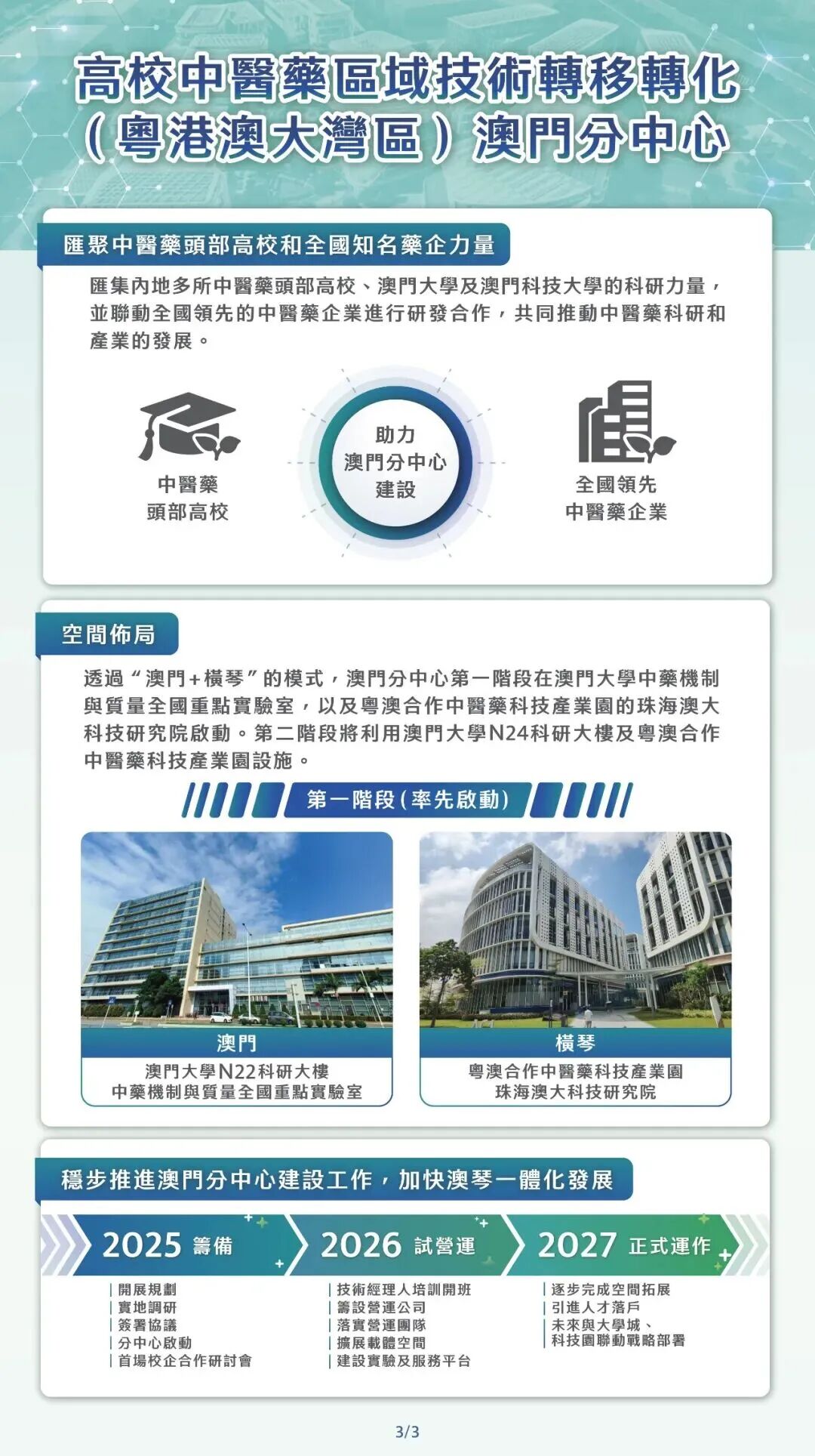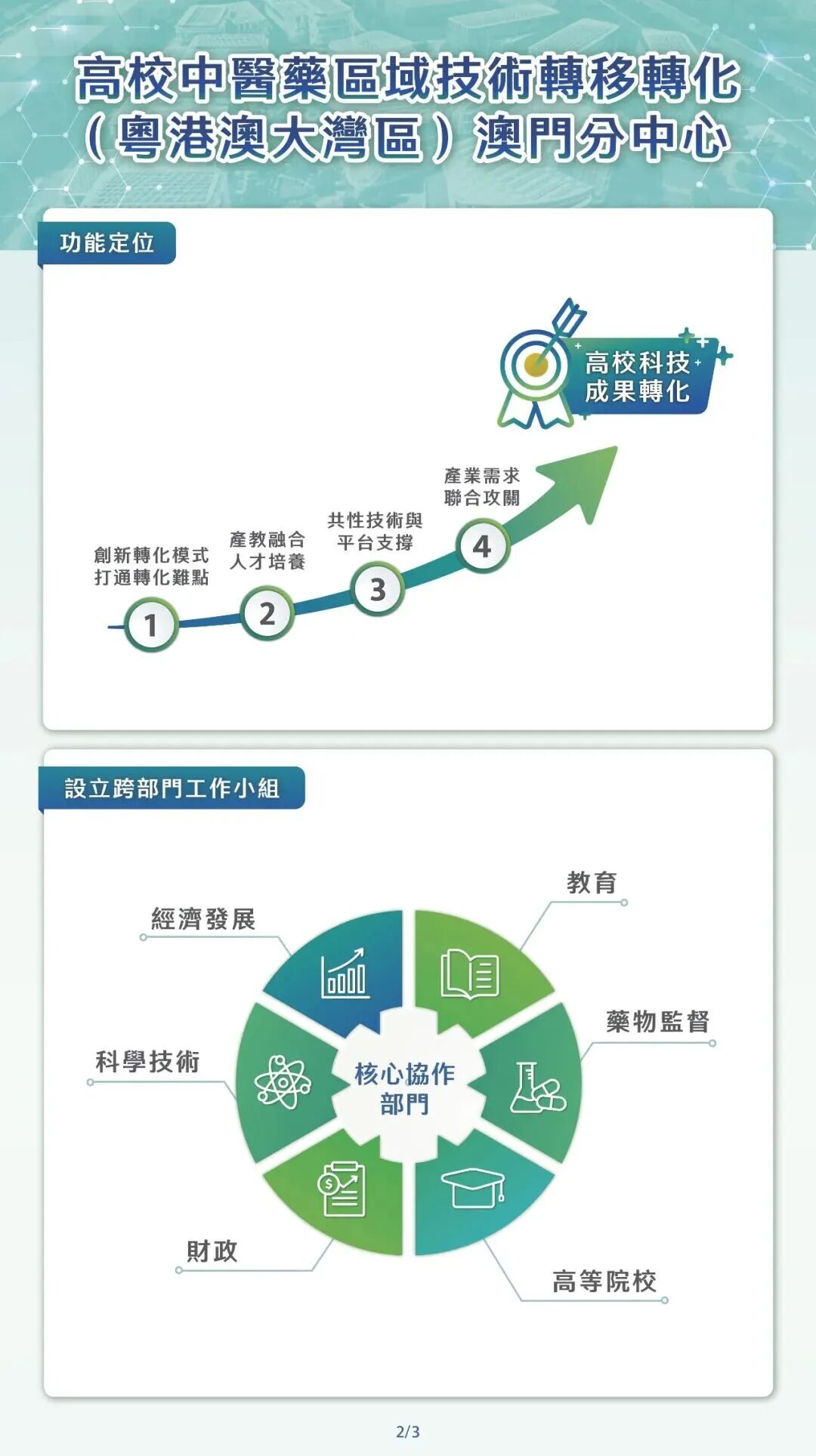 为加速创新成果的集聚与转化,澳门特区政府积极筹建高校中医药区域技术转移转化(粤港澳大湾区)澳门分中心,将连结内地与澳门中医药头部高校的科研团队和企业,并善用澳门高校全国重点实验室和合作区珠海澳大科技研究院等科技平台,建设服务与实验平台,联动政、产、学、研、金的力量,全力支援中医药大健康产业发展,实现科研成果从“书架走到货架”,并以“澳门注册+横琴生产”模式,推动优质的中药产品进入国际市场,全球销售。