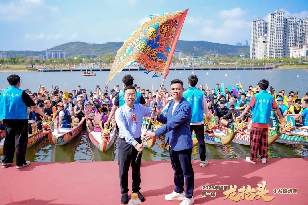 为鼓舞横琴龙舟代表队士气,现场还举行了庄重的授旗仪式,叶真为横琴代表队授旗,这支队伍即将代表横琴出战全国职业联赛及大湾区各项赛事,承载着琴澳两地对龙舟运动发展的殷切期望。