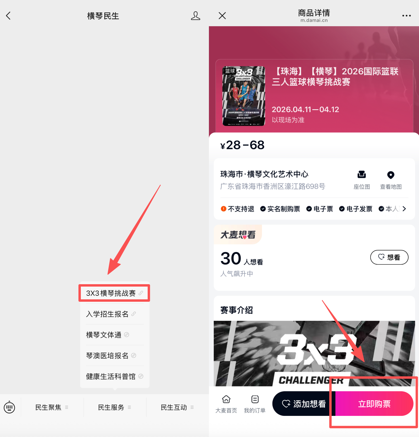广大篮球爱好者可通过大麦网,或“横琴民生”微信公众号、“横琴文体通”微信小程序购票。