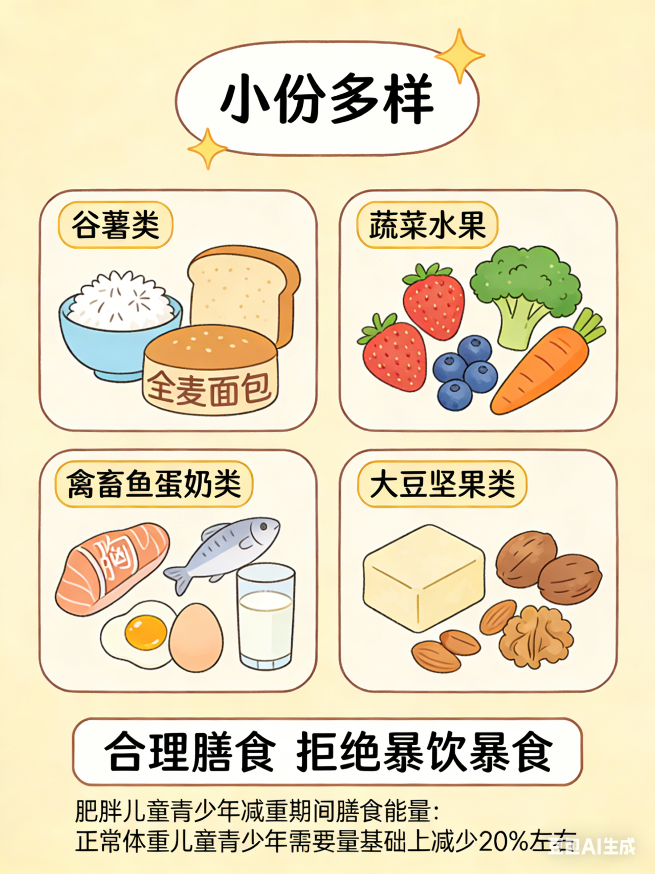 拒绝暴饮暴食,选择小份量的食物,控制食物摄入总量。每天摄入的食物应包括谷薯类、蔬菜水果、禽畜鱼蛋奶类和大豆坚果类,营养均衡不缺失。