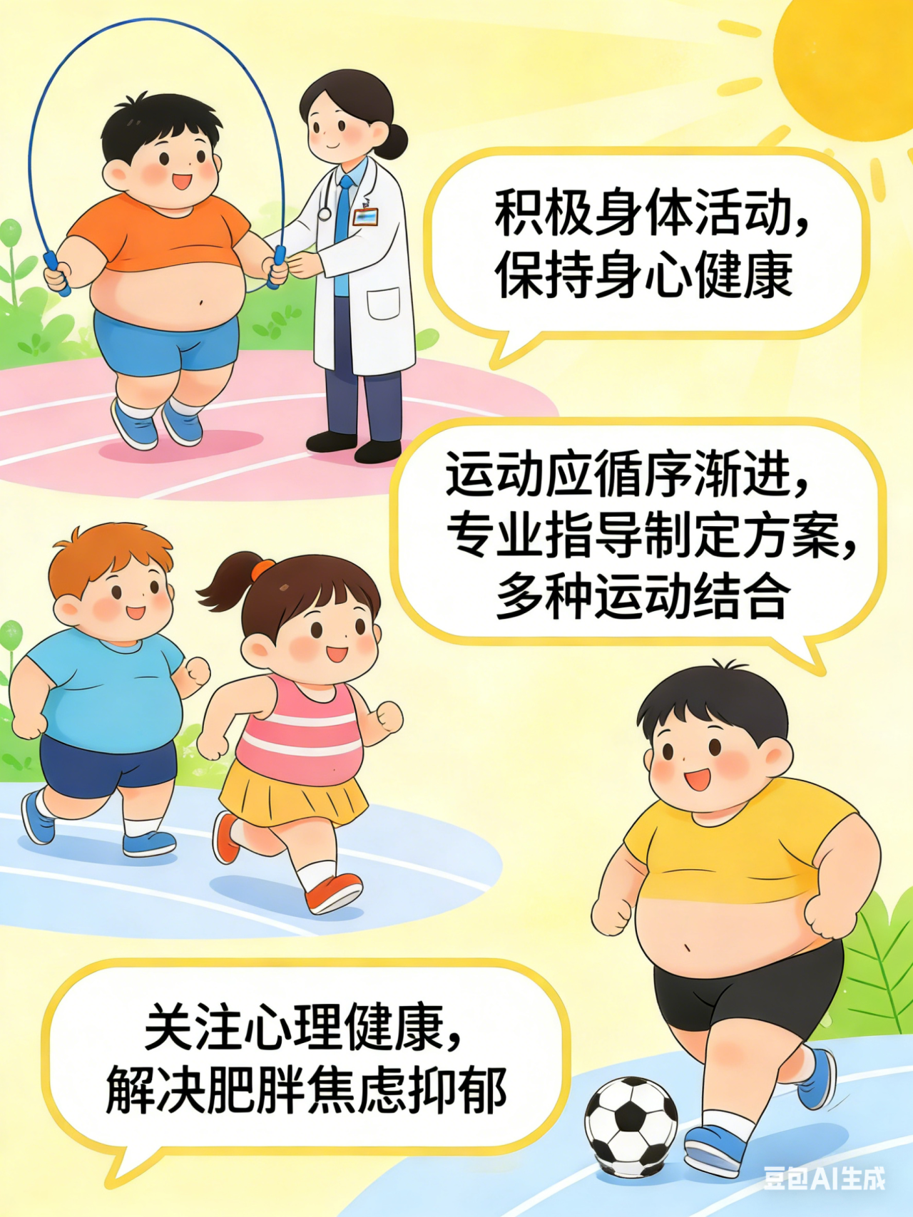运动应遵循循序渐进的原则,在专业人员指导下,制定适合孩子的运动方案,鼓励多种运动方式结合。同时也要关注孩子心理健康,解决肥胖带来的焦虑、抑郁等心理问题。