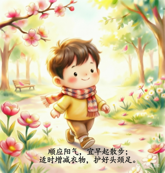 顺应阳气,宜早起散步,适时增减衣物,护好头颈足。
