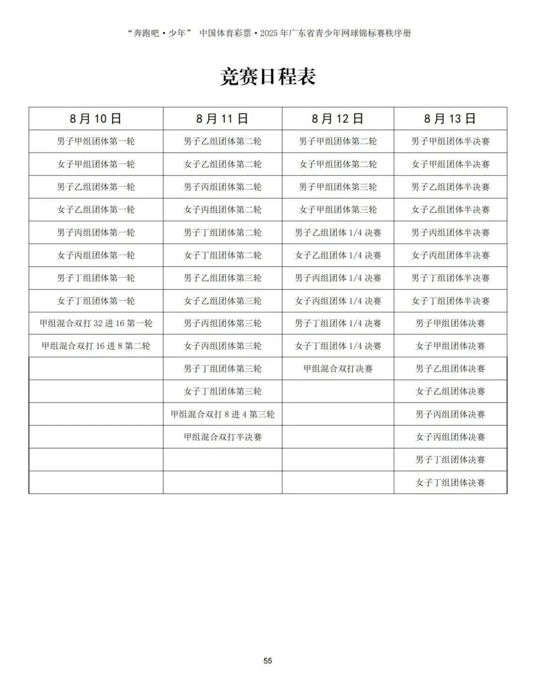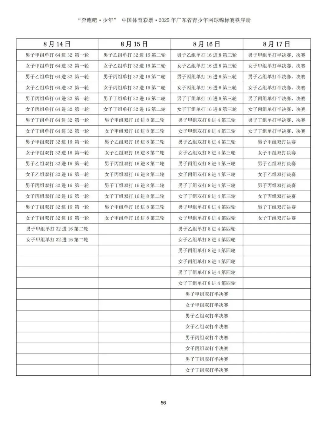 赛事共设甲、乙、丙、丁四个年龄组别,涵盖单打、双打、团体赛,共25个比赛项目。来自广州、深圳、珠海、东莞、江门、清远等省内19个地市的23支代表队,584名青少年网球运动员将齐聚横琴,在各项目中展开激烈角逐。