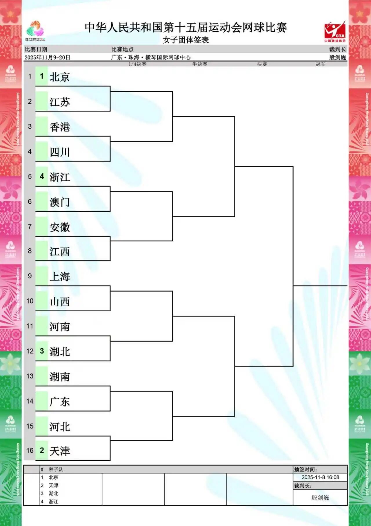 随着团体比赛签表出炉,十五运会网球比赛也将于明日正式拉开帷幕。11月9日至12日期间,各地代表队将按照赛程展开捉对厮杀,最终经过四轮赛事于12日决出团体赛两枚金牌。