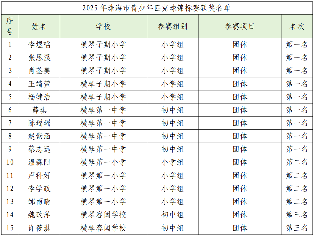 横琴青少年匹克球队在本届赛事一路过关斩将,全队共斩获4个前三名席位,其中2枚金牌、1枚银牌及1枚铜牌,充分展现了横琴青少年匹克球队的硬实力。
