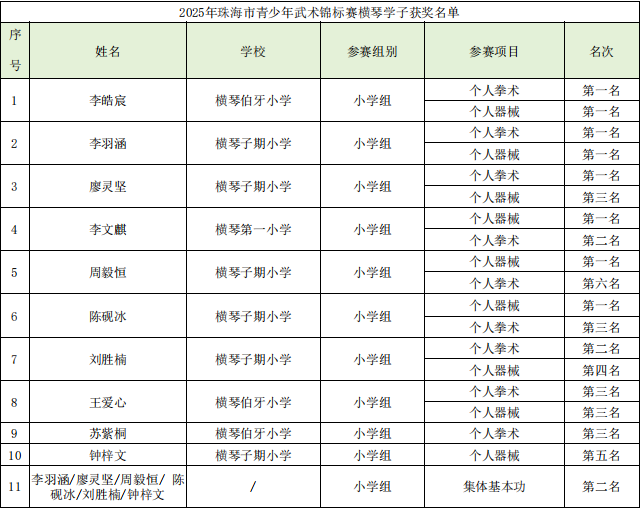 这支队伍在短短一年时间里完成了从零基础到赛场上争锋的蜕变。本届赛事中,队员们稳扎稳打,共斩获19个前八名席位,其中8枚金牌、3枚银牌与5枚铜牌,展现了横琴青少年武术队的潜力。