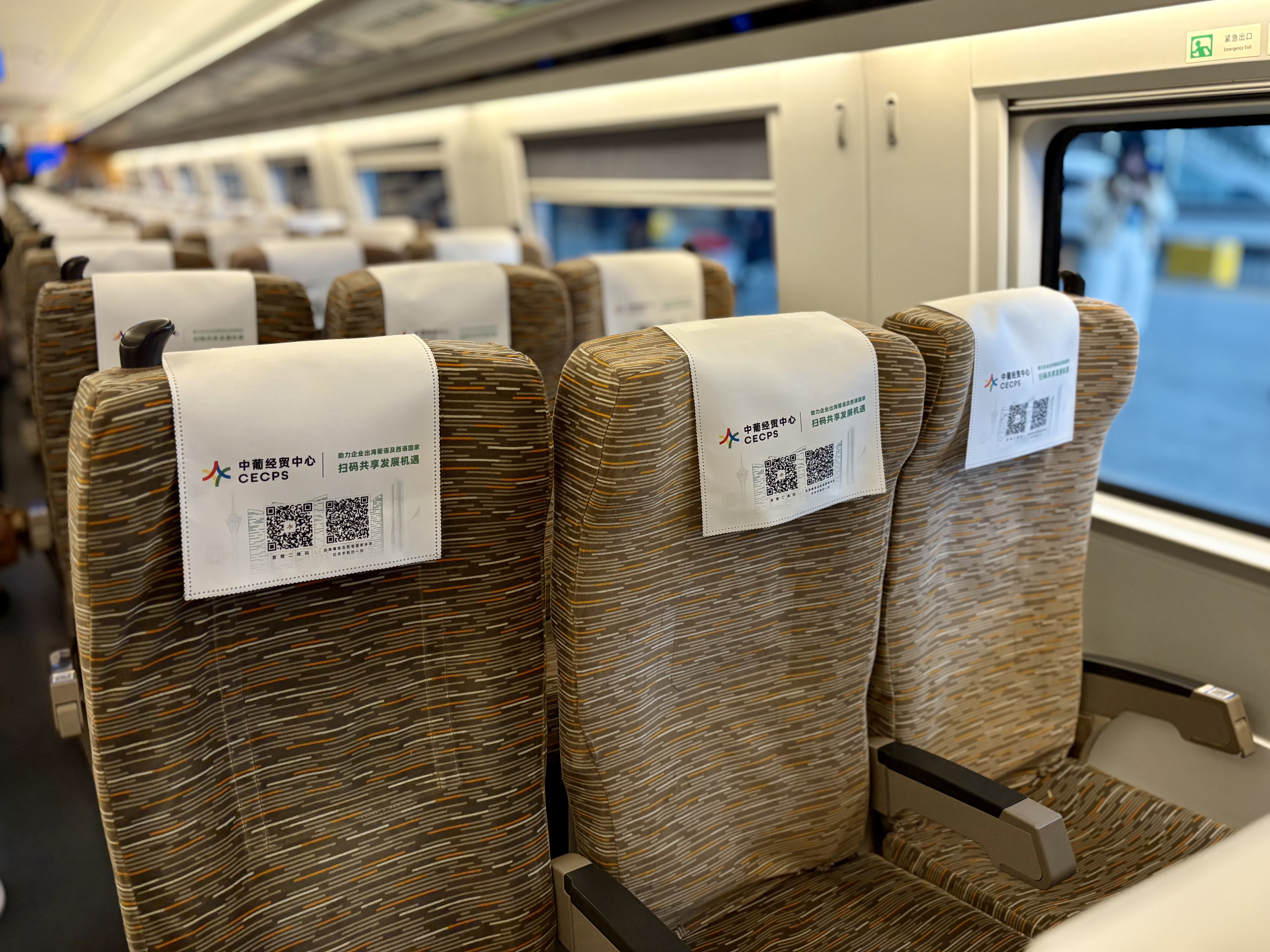 The designated train G2264 features vibrant exterior graphics showcasing the dynamic symbol of Hengqin. Inside, the carriages have been transformed into immersive brand showrooms, detailing CECPS's ten core service functions, focusing on connecting Hengqin and Macao, as well as linking Lusophone and Hispanic markets.