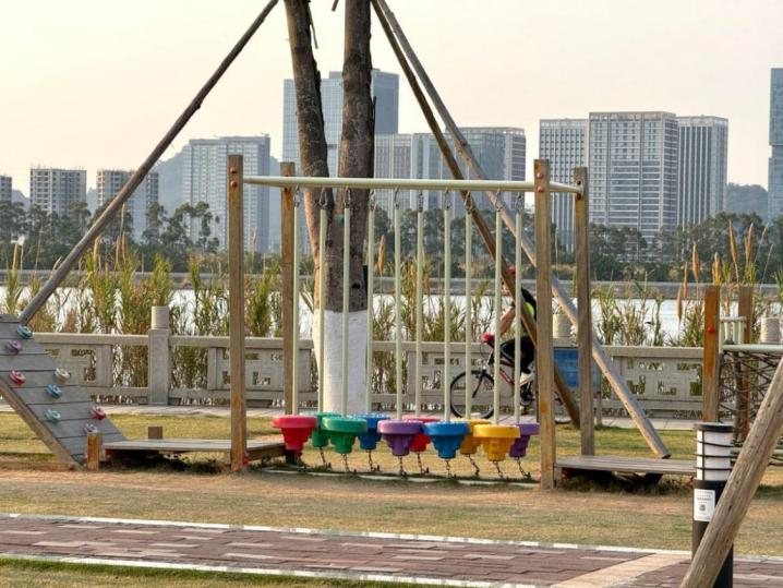 沿着滨海绿道向西骑行不久,便抵达横琴花海长廊2号驿站。这里设有儿童游乐设施和大片开阔草坪,是家庭骑行途中理想的休憩站点。