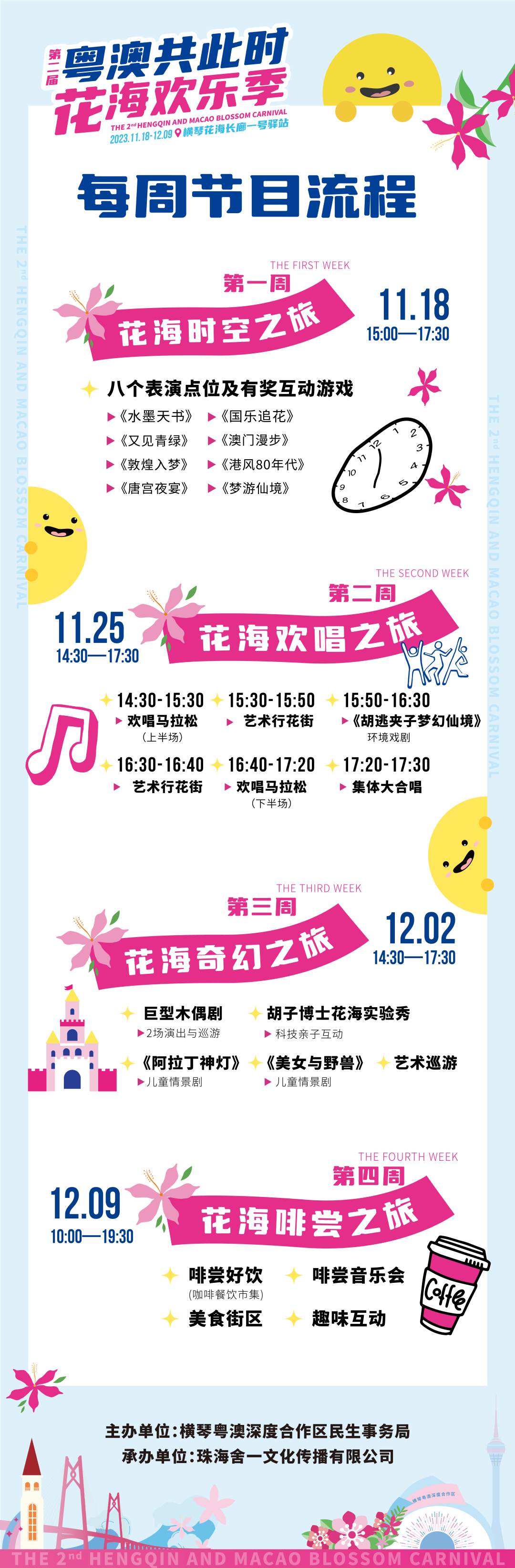 为充分发挥横琴特色的自然和空间资源优势,丰富琴澳居民业余休闲的文化生活,由横琴粤澳深度合作区民生事务局主办的第二届“粤澳共此时”花海欢乐季将于11月18日(本周六)在花海长廊一号驿站正式开幕。