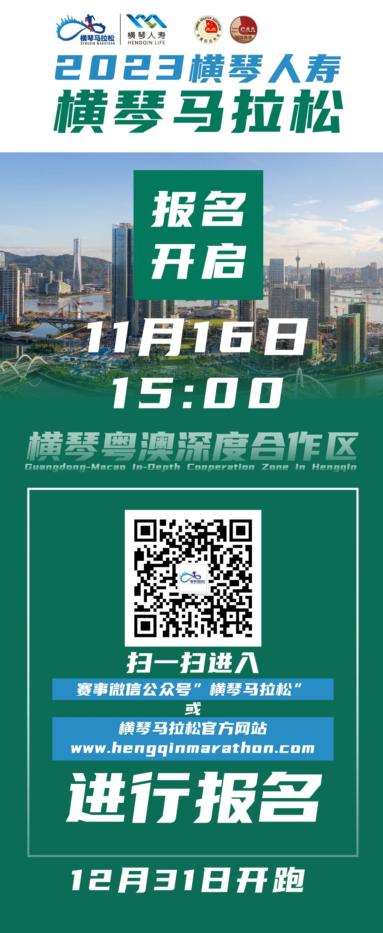 11月16日15时,2023横琴人寿横琴马拉松开启报名!12月31日,横琴马拉松正式开跑!快来报名,一起体验“横琴速度”!