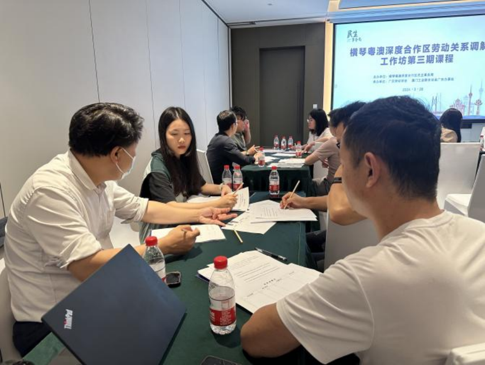 3月28日,横琴粤澳深度合作区民生事务局联合广东劳动学会、澳门工会联合总会广东办事处举办的劳动关系调解工作坊第三期课程顺利结业。来自横琴粤澳深度合作区根治拖欠农民工工资工作领导小组各成员单位的业务骨干、重点企业人力资源代表,以及建筑领域项目劳资专员等50余人参加培训,共同探讨劳动关系调解的工作技能及实践经验。