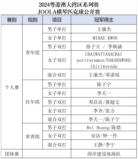 经过三天的激烈角逐,个人赛青年组男女单打冠军由王康杰 / MIHAE KWON获得,青年组男双冠军由徐子立 / 李焕涵获得,青年组女双冠军由CHAIWATTANACHAI pattraramon/NAKARAWONG thitiworada获得,青年组混双冠军由王康杰/邓诺瑶获得;壮年组方面,陈子宁和李天一分获壮年组男女单打冠军,壮年组男双冠军由邓昌良/黄超文获得,壮年组女双冠军由李齐/张方获得,壮年组混双冠军由李天一/陈子宁获得;常青组男双冠军由Wei Huang/陈焓获得,常青组女双冠军由安洁/钟一丹获得,常青组混双冠军由王静/李宁获得;团体赛由西岸建设珠海队摘得桂冠。