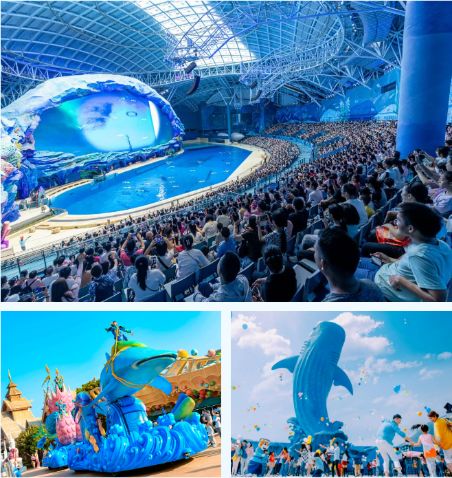 还可以挑战超刺激的过山车,观赏各种海洋动物如鲸鲨、海豚、海狮等。孩子们也可以边玩边学,参与特色科普活动。