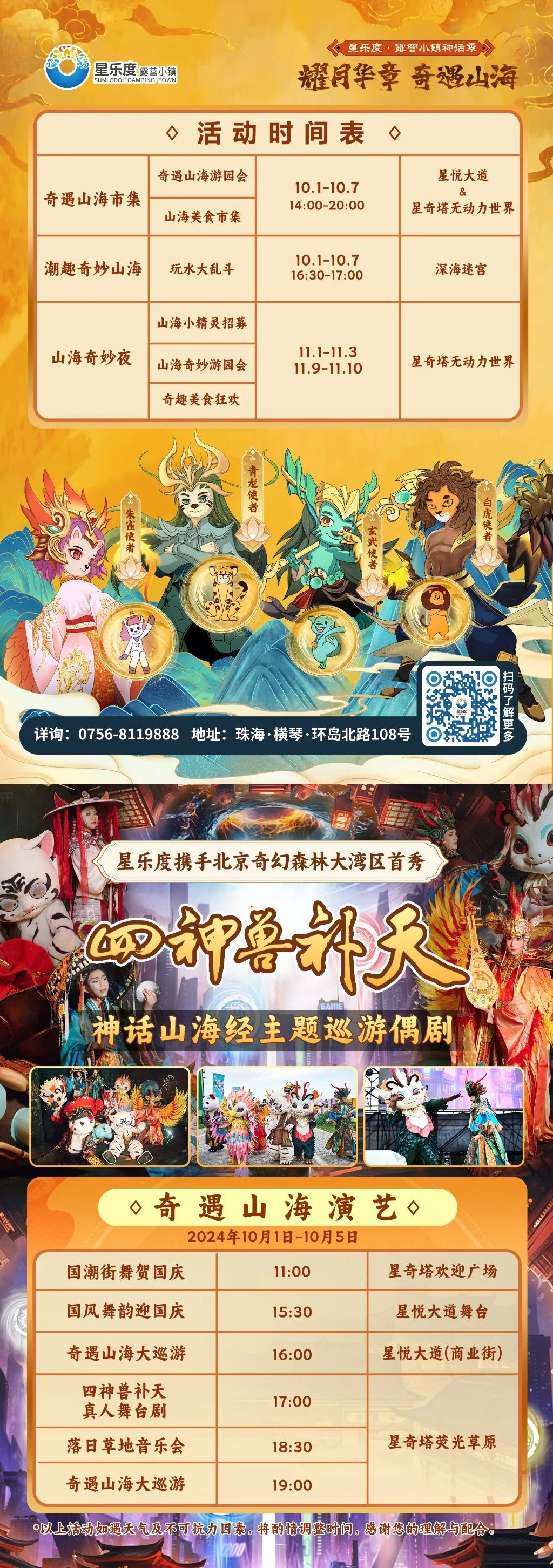 10月1日至5日,星乐度·露营小镇携手北京魔术团,特别呈现山海经四神兽奇幻巡游偶剧——《四神兽补天》。将古老神话故事与现代魔幻元素巧妙融合,为游客带来新国风美学奇幻之旅。