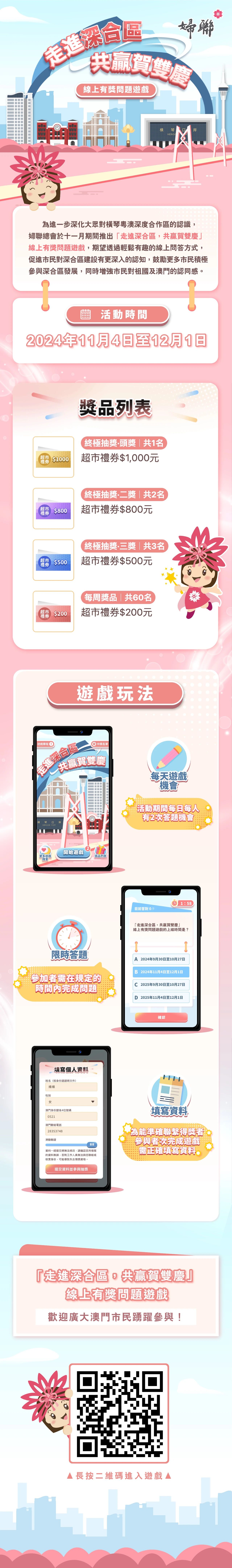 为了让澳门居民对横琴粤澳深度合作区有更加深入的了解,最近,澳门妇联推出在线游戏,邀请广大澳门居民一起答问题,赢礼券!