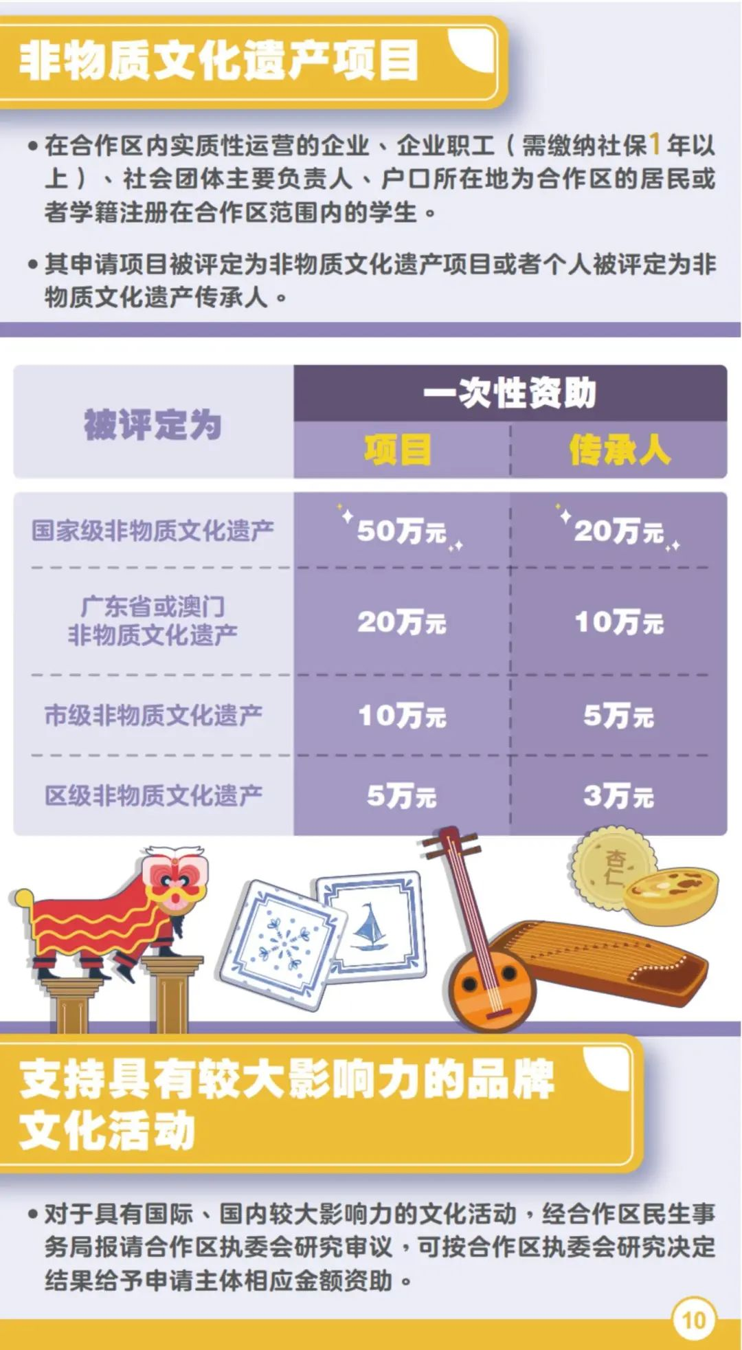 对于在合作区举办主题文化创意类、影视作品展示、舞台艺术展演类、原创文艺作品展示类、文化艺术展览类的惠民文化活动,以及舞台艺术类文化赛事,符合条件的最高可获300万元的资助。