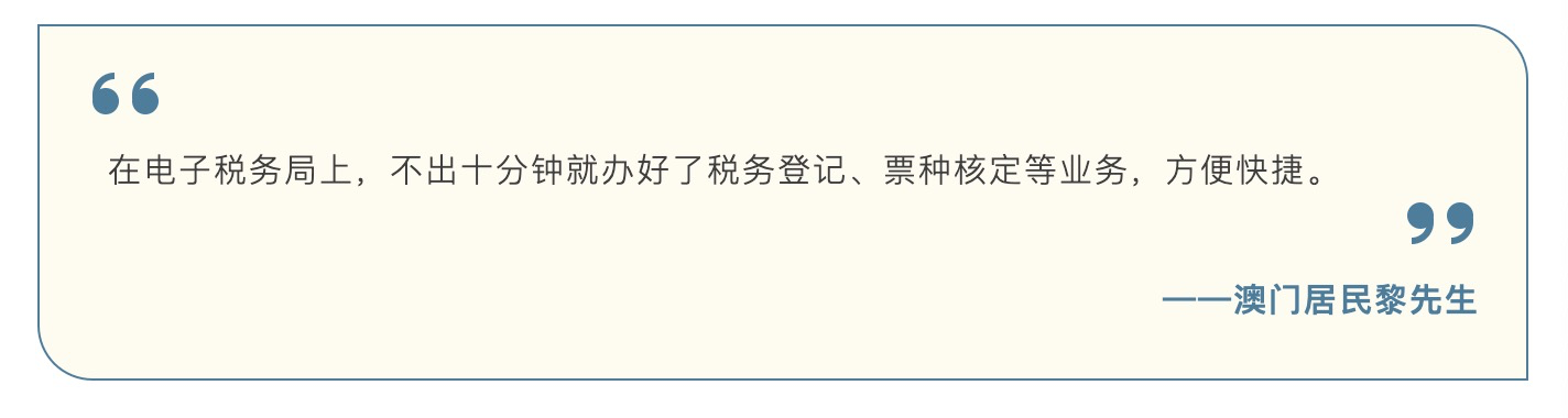 不久前,澳门居民黎先生登记注册了一家科技型企业,通过税务部门提供的新办纳税人“套餐式”服务很快办理好了各项业务。当地税务部门深化税收征管改革,持续拓展“非接触式”办税缴费事项清单,受到纳税人和缴费人欢迎。
