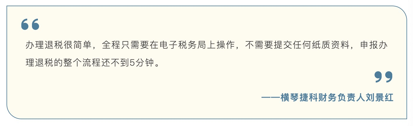 横琴捷科科技有限公司是尝到了合作区分线管理“头啖汤”的澳资企业之一。在实施分线管理当天,横琴捷科经“二线”从内地购入了一批货物,并于次月办理了出口退税。