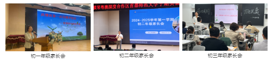 ▶ 召开家长会,达成教育共识。2024年11月学校分别召开了初一年级、初二年级、初三年级家长会。期中后的家长会是家校深入沟通、共同促进学生成长的重要渠道。