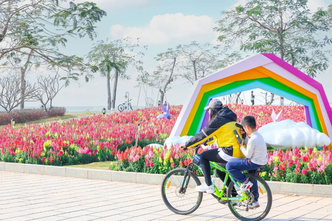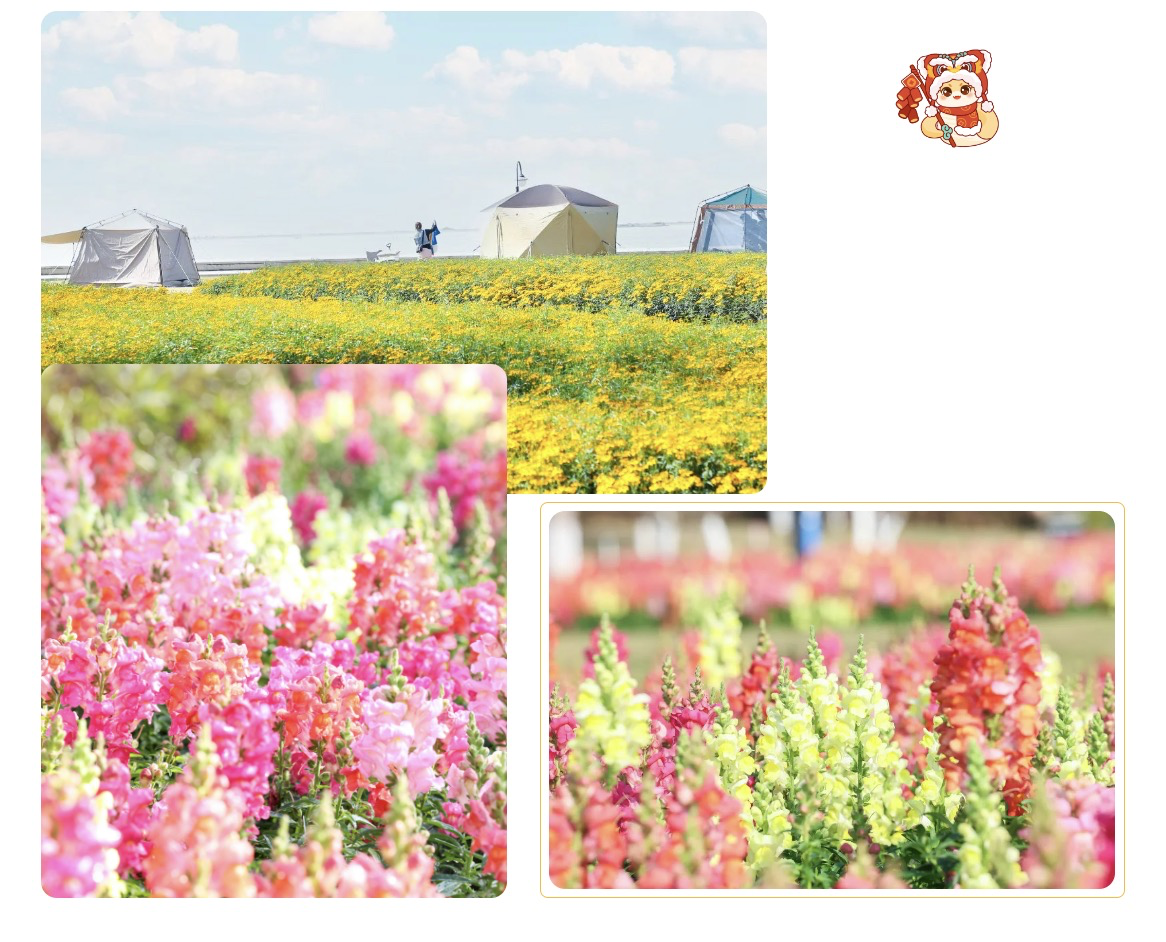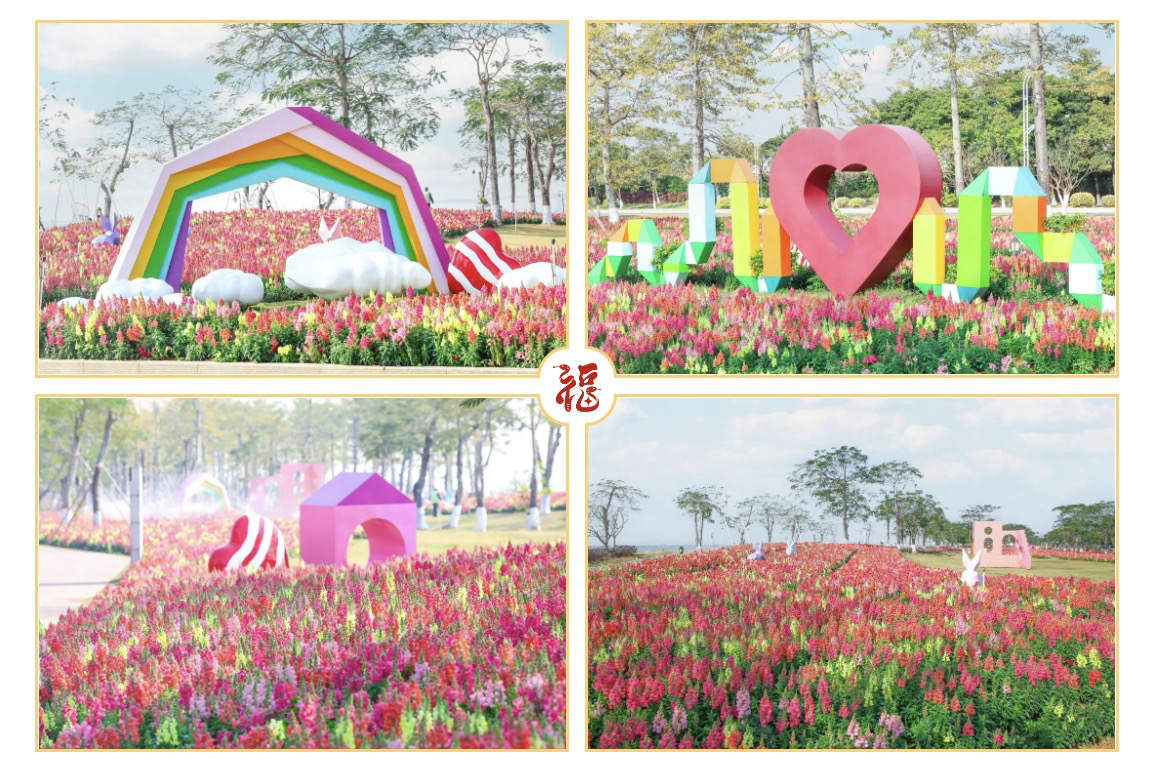 春节期间,花海长廊五号驿站附近迎来了一场绚丽多彩的花海盛宴,约16000平方米的金鱼草花海和2000平方米的芳香万寿菊竞相绽放,为居民和游客带来了视觉与嗅觉的双重享受。