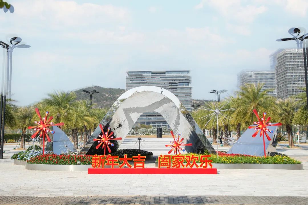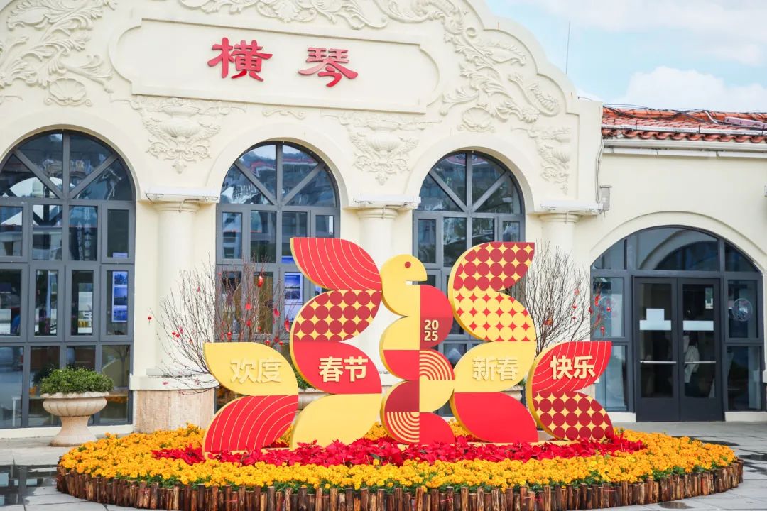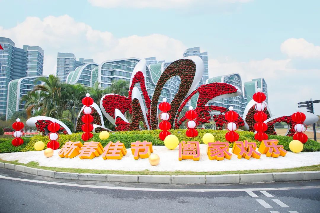 横琴码头的造景,将红、黄色花卉与蛇形图案立体构件进行组合搭配,仿佛金蛇在花丛中舞动,灵动而富有生机,为码头增添了一抹浓郁的节日色彩。
