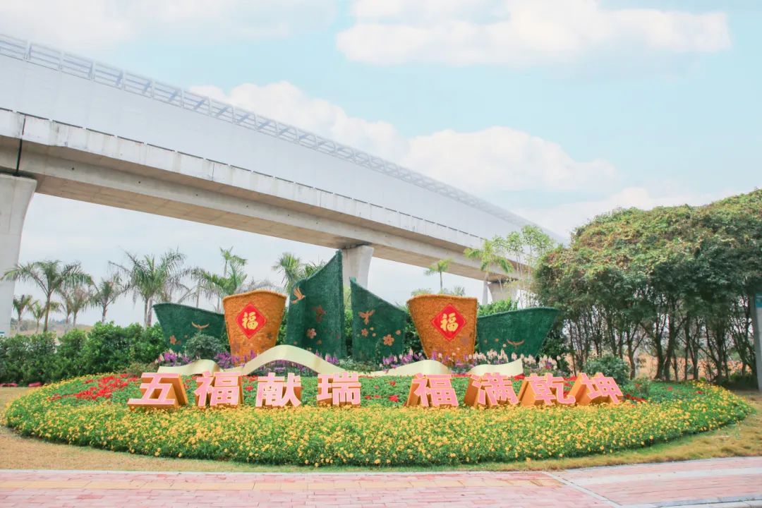 横琴二桥的造景,以“五福献瑞 福满乾坤”为主题,采用红、黄色调的植物铺设成特色花镜,在立体景观上,装扮合作区特色鸟类剪影与“福”字饰品,传递着新春的美好祝愿,为人们带来满满的福气与喜悦。