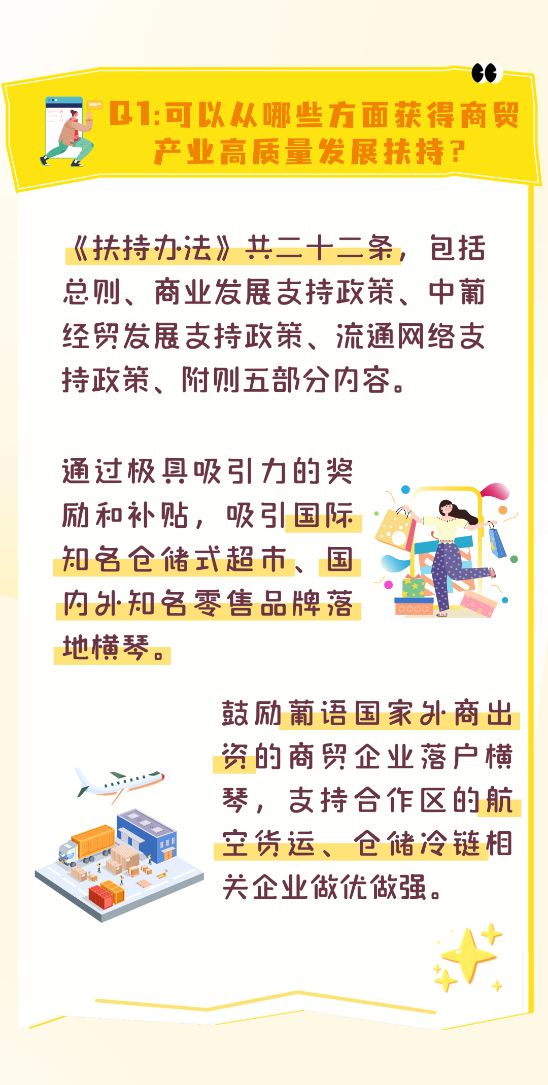 《横琴粤澳深度合作区商贸产业高质量发展扶持办法》希望吸引国内外零售消费品牌大型超市、澳门特色店等方面企业落户横琴,打造具有国际影响力的商贸中心,一起来仔细看看政策内容。