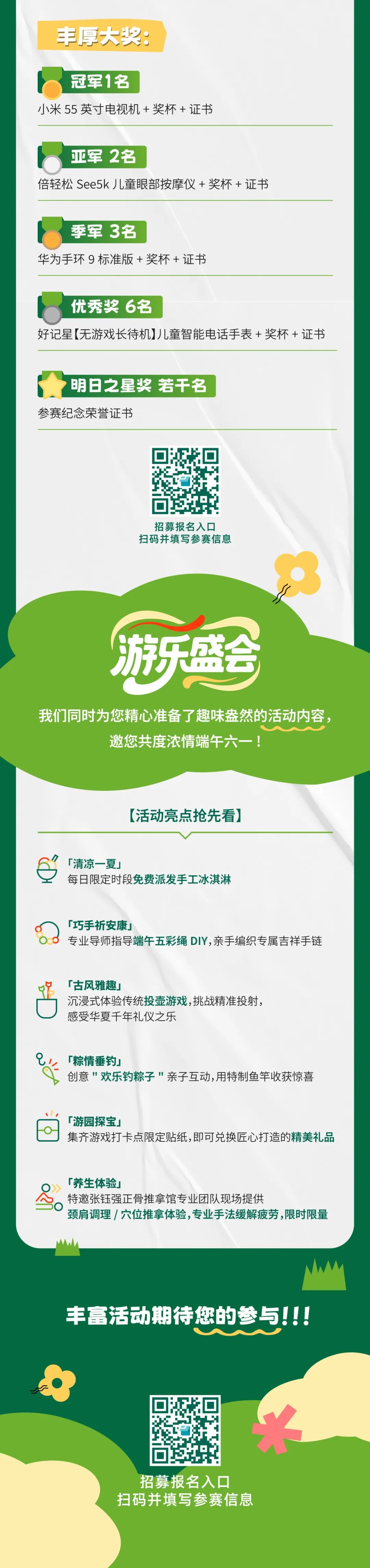 这个端午假期,让孩子成为文化传承的小使者,无论是一展才艺,争夺荣耀大奖,还是畅玩端午游园会,收获欢乐回忆,这里都能满足!