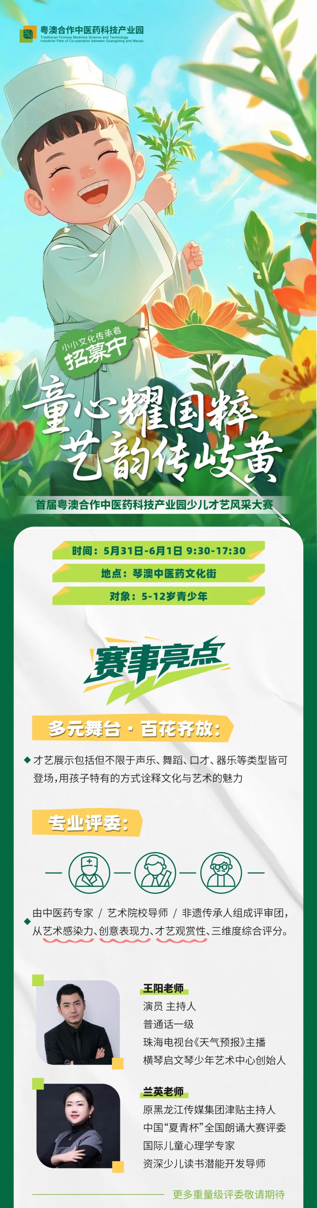 首届粤澳合作中医药科技产业园少儿才艺风采大赛火热开启,诚邀5-12岁的小小文化传承者登台献艺。