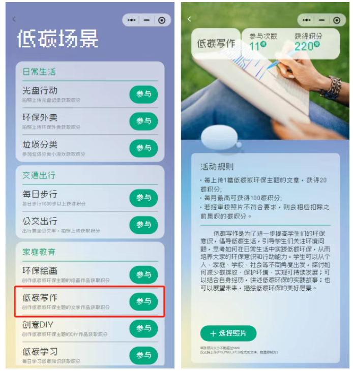 其中,“低碳写作” 是家庭教育板块功能模块的重要组成部分。该模块旨在引导用户,尤其是学生群体,对低碳、可持续发展等话题展开深入思考,并通过写作、绘画及创意 DIY 作品等形式展现环保理念。