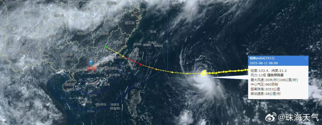 珠海市气象局8月11日10时10分发布消息,目前台风“杨柳”(11级,强热带风暴级)位于台湾东偏南方约1200公里的西太平洋洋面上,预计其将于13日穿过台湾之后趋向福建南部到广东东部一带沿海。