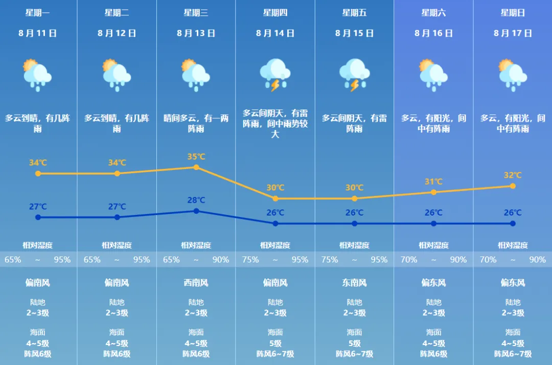 预计本周前期,横琴以晴热天气为主,间中有几阵雨;中期受“杨柳”残余环流影响,雷雨频密;后期阳光阵雨相伴。