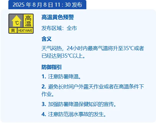 温馨提示:全市高温黄色预警信号正在生效,请注意防暑降温。