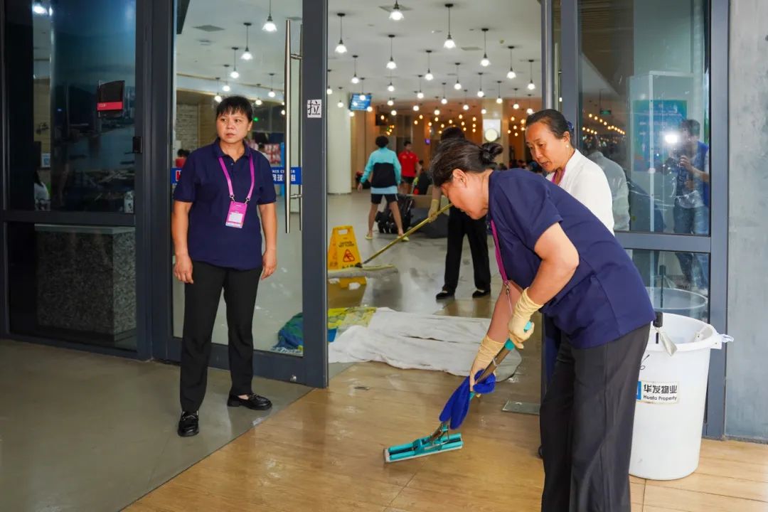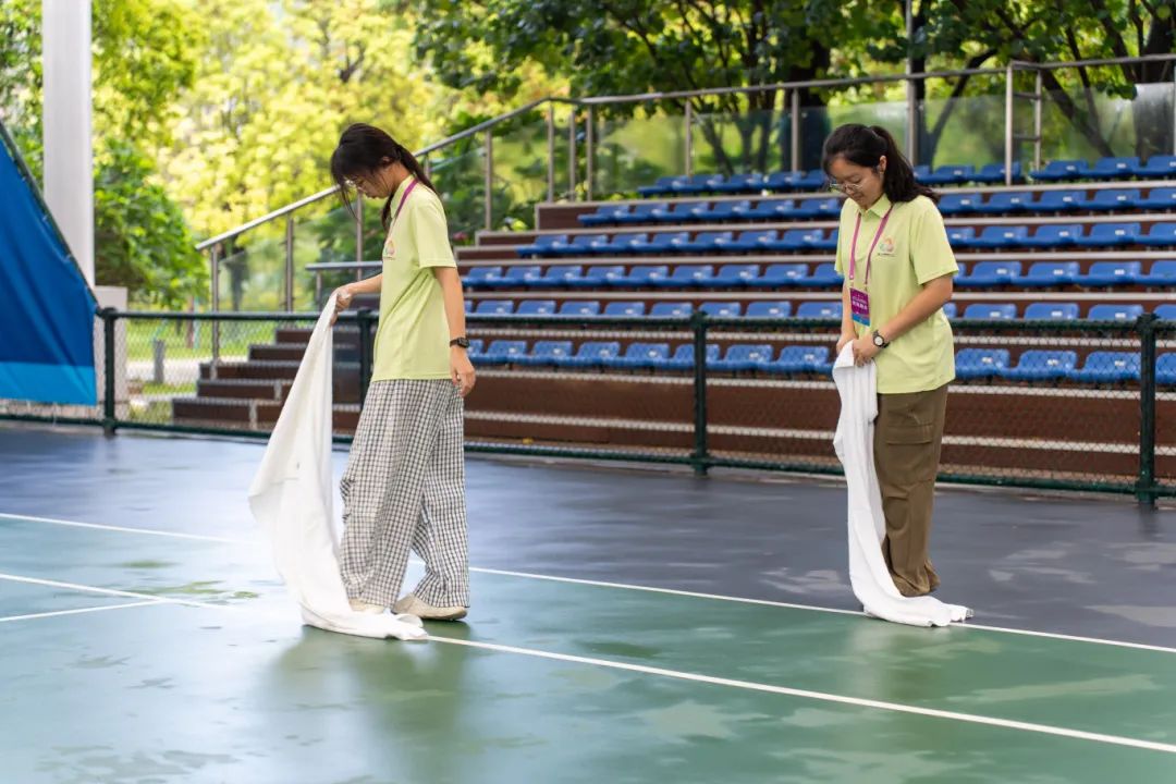 降雨停止后,在竞赛组织处统一调度下,赛事相关单位值守人员、场地服务团队及志愿者迅速响应,共同参与到场地恢复工作中。场地服务组在雨停后立即行动,利用推水器、毛巾等工具快速清除赛场积水;观众服务组同步协同保洁人员,高效清理观众席区域积水,保障观赛环境安全;各部门协同配合,形成高效作业链。