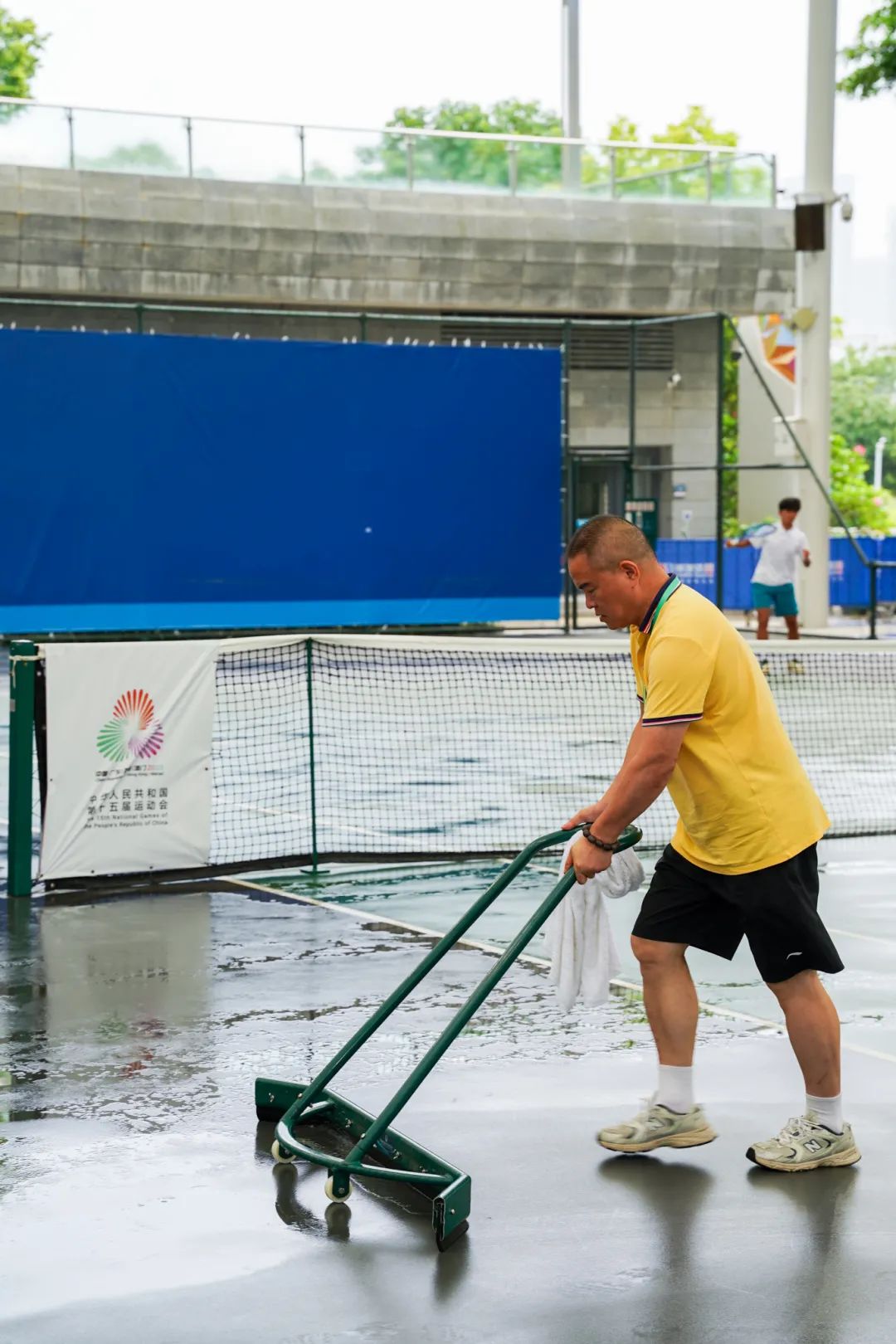 面对突发大雨,赛事竞委会迅速启动应急预案,提前调集大毛巾、球场推水器、地面吹干机等专业物资,确保场地清理工具即刻到位。