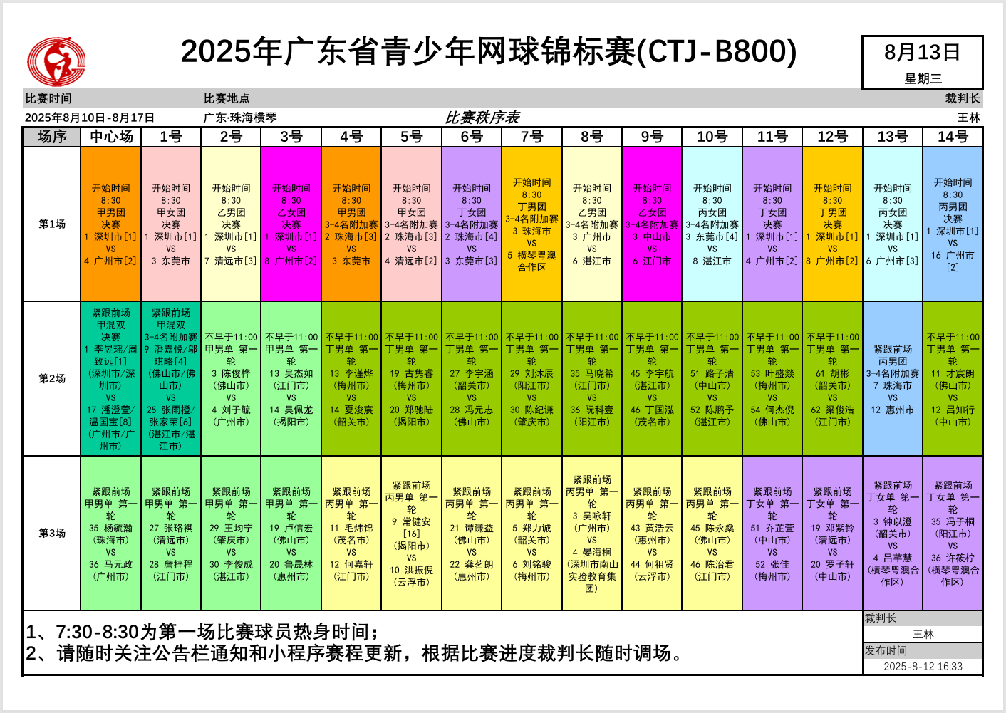 预计13日上午开始将陆续进行混双、团体赛9场颁奖。赛事结果将更新至广东省社会体育和训练竞赛中心官网及“网球记赛事”微信小程序。