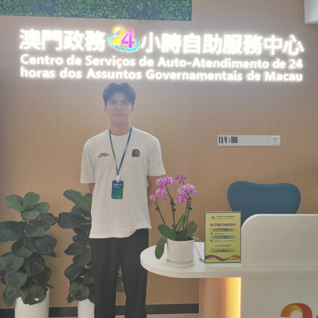 在实习的一个多月里,我驻守于横琴“澳门新街坊”的澳门政务24小时自助服务中心,协助澳门居民办理身份证、护照、各类证明书等事务。期间我常遇到年长者或不熟悉系统操作的居民,我耐心引导、聆听需求。这段经历不但提升了我的服务意识,也让我体会到政务工作的温度与重要性。