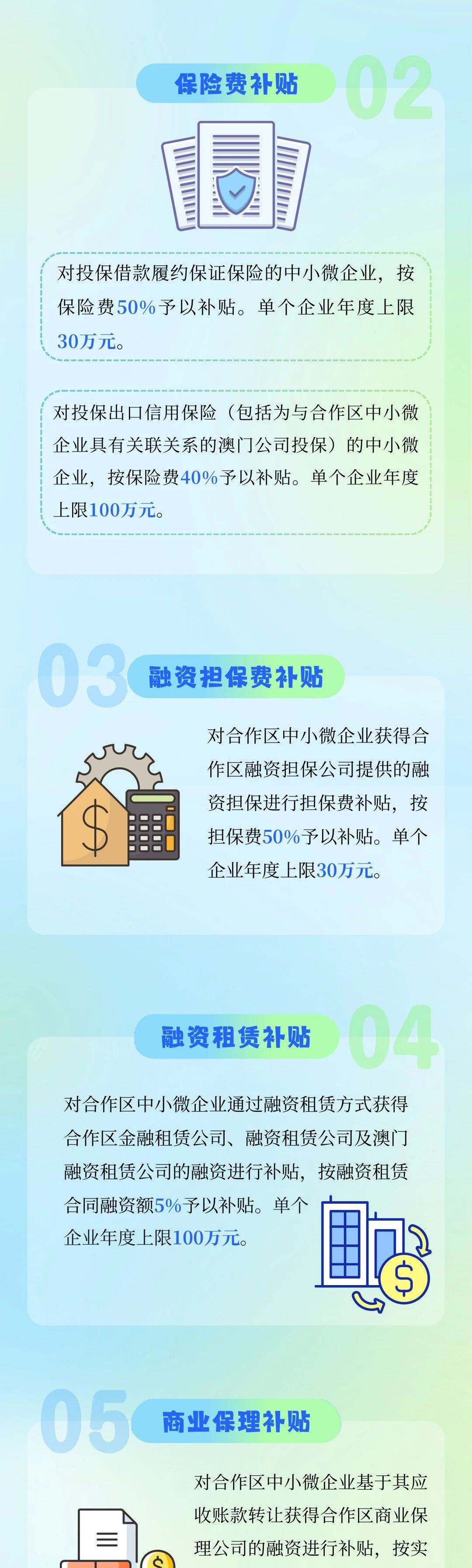 《扶持办法》从贷款贴息、保险费补贴、融资担保费补贴、融资租赁补贴、商业保理补贴五个方面,对合作区中小微企业给予一定比例的贴息和各类费用补贴,助力中小微企业可持续发展。同时,针对高新技术企业、专精特新中小企业等设置了更高扶持标准,引导中小微企业转型升级,形成正向激励。