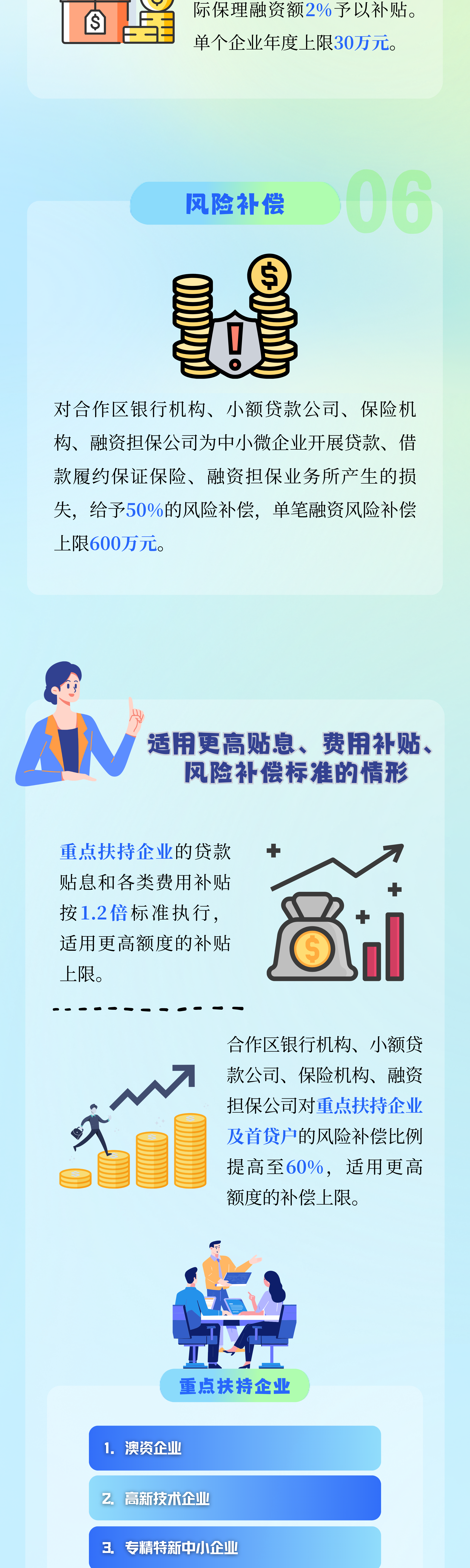 《扶持办法》对金融企业损失予以风险补偿,让机构敢放敢贷。《扶持办法》对合作区银行机构、小额贷款公司、保险机构、融资担保公司向合作区中小微企业开展贷款、借款履约保证保险、融资担保业务所产生的损失,给予一定比例的风险补偿。风险补偿比例最高可达60%,单笔融资风险补偿最高达720万元。