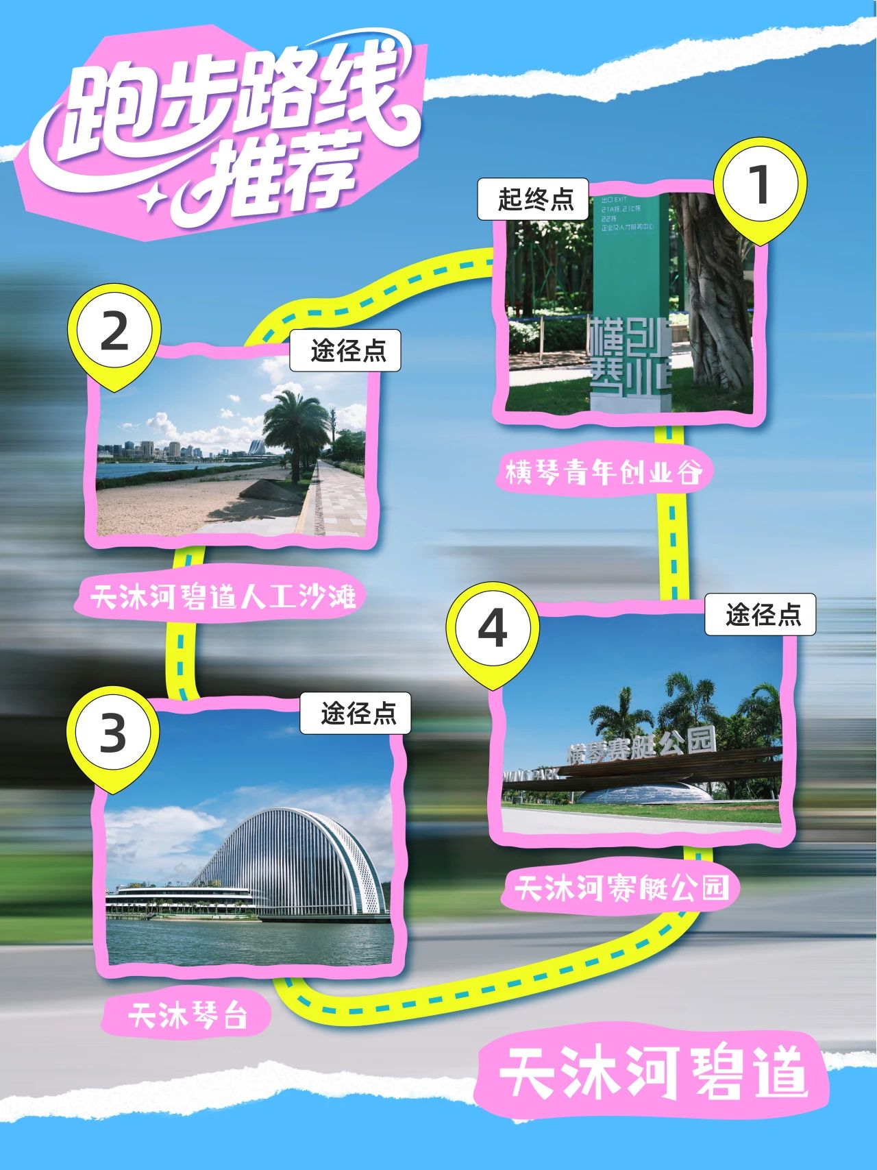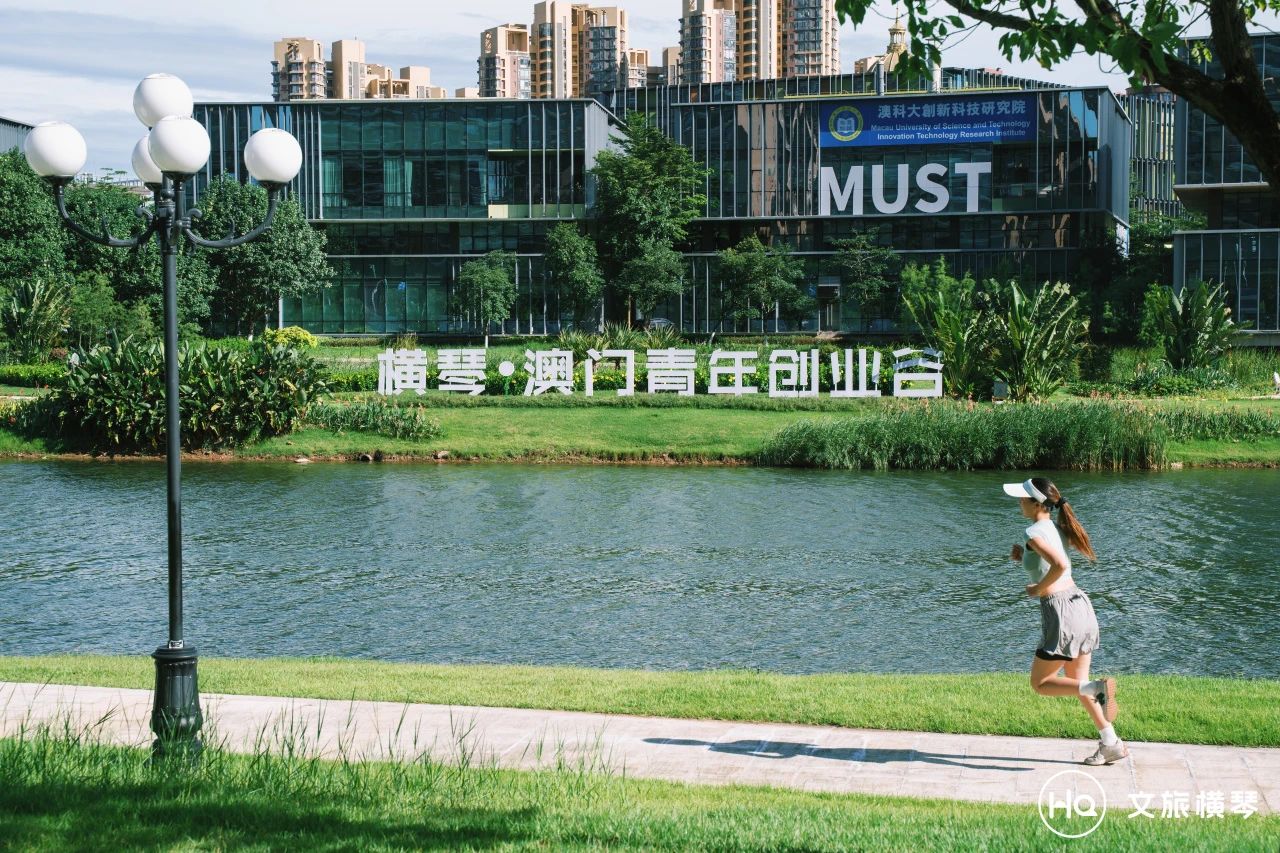 从横琴·澳门青年创业谷起,循着天沐河碧道至赛艇公园,再从赛艇公园返回创业谷,全程大约10公里。