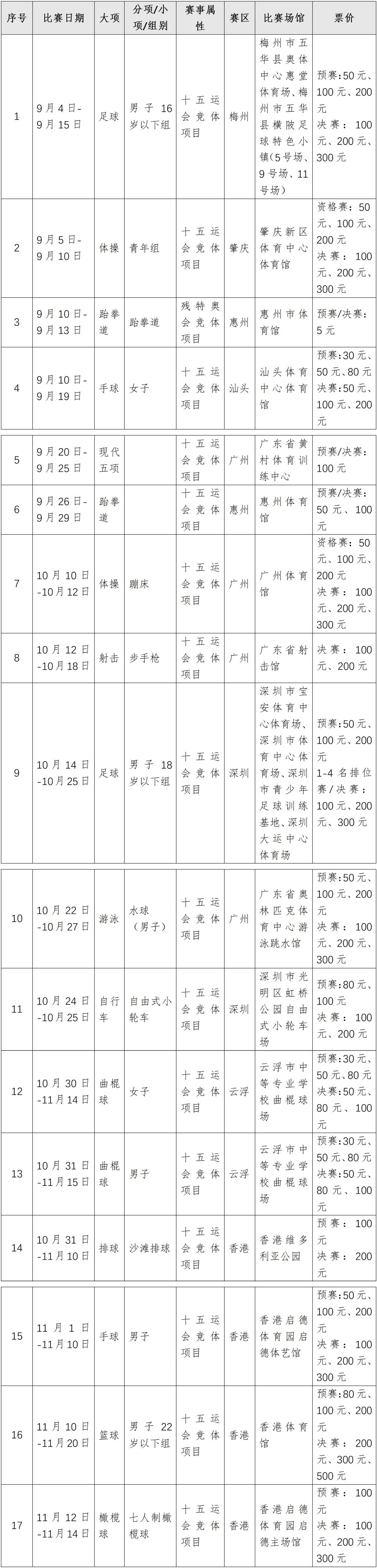 本阶段开售项目包括分别在广州、深圳、汕头、梅州、惠州、肇庆、云浮和香港举办的十五运会足球(男子16岁以下组)、足球(男子18岁以下组)、体操(青年组)、体操(蹦床)、手球(女子)、现代五项、跆拳道、游泳(男子水球)、射击(步手枪)、自行车(自由式小轮车)、篮球(男子22岁以下组)、手球(男子)、曲棍球(男子)、曲棍球(女子)、橄榄球(七人制橄榄球)、排球(沙滩排球)和残特奥会跆拳道共17个项目,面向公众可售门票约70万张,其他项目赛事门票,将根据竞赛安排分阶段、分批次释放销售,敬请关注。