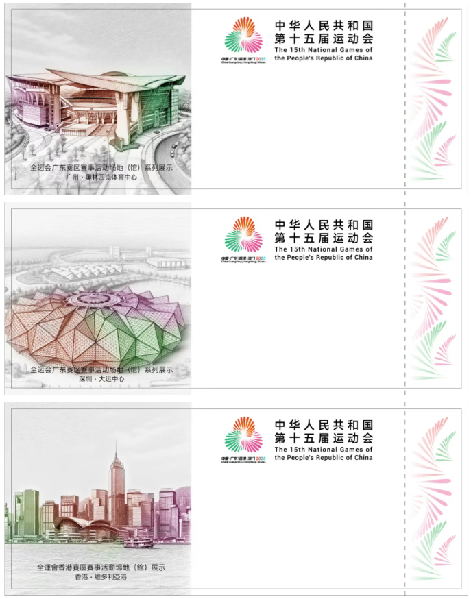 首批面世的十五运会和残特奥会体育比赛门票票面版式于8月26日对外发布。票面设计以粤港澳三地赛事活动场地(馆)为核心设计元素,用素描手法构筑建筑基底,运用十五运会和残特奥会主视觉三色渐变交融的独特手法,以艺术的形式体现湾区融合与赛会体育精神。每个举办城市都有专属票面版式,随机用于不同的比赛项目,为历届赛会首创。更多的票面版式将陆续向公众公布。
